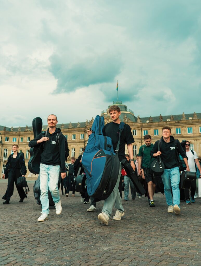 Am nächsten Tag begaben wir uns auf die lange Busfahrt durch den Stuttgarter Berufsverkehr. Trotz einiger Verspätung hielten wir inne, um das Neue Schloss und seinen Konzertraum zu bewundern. Die Akustik war atemberaubend und wir hatten sehr viel Spaß beim Spielen unseres ersten Konzertes. Auch angereist war das Filmteam rund um Familie Pfarr, um sich das Konzert anzuhören und sich auf den Livestream am kommenden Tag vorzubereiten.